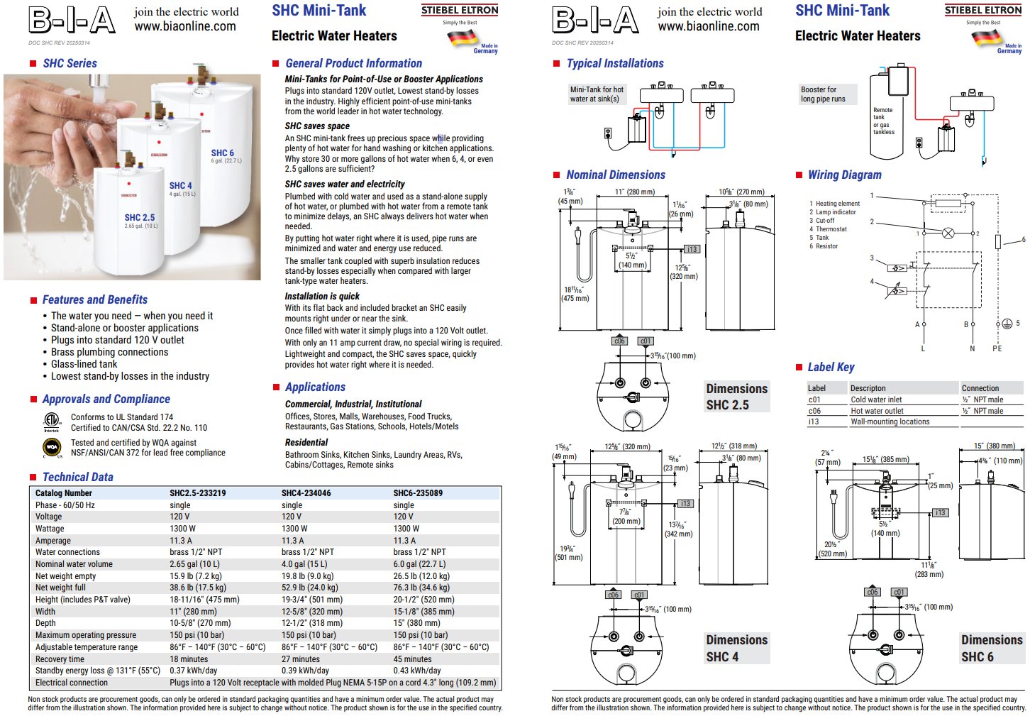 000000|SHC6-235089|/catalog/products/130/130509_1.jpg|/catalog/products/130/img/130509/130509_1_XL.svg|Model Number: SHC 6, Product Type: SHC Mini-Tank Water Heater, Rated Voltage: 120 Volt AC, Rated Current: 11.3 Amp, Wattage: 1300 Watt, Phase: Single (60/50 Hz), Electrical connection: Plugs into 120 V receptacle with supplied cord 43" long (1.092m) NEMA 5-15P Plug, Water Connections: Brass 1/2" NPT, Nominal Water volume: 6.0 gal (22.7 L), Weight empty: 26.5 lb (12.0 kg), Weight full: 76.3 lb (34.6 kg), Height (includes P&T valve): 20-1/2" (520 mm), Width: 15-1/8" (385 mm), Depth: 15" (380 mm), Maximum operating pressure: 150 psi (10 bar), Adjustable temperature range: 86°F to 140°F (30°C to 60°C), Recovery time: 45 minutes, Standby energy loss @ 131°F (55°C): 0.43 kWh/day, c(ETL)us Intertek: Conforms to UL Std. 174; Certified to CAN/CSA Std. 22.2 No. 110, c(WQA)us: Tested and certified by WQA against NSF/ANSI/CAN 372 for lead free compliance||Z|130509|14.12.2025 07:01h|Piece||||||||||||||Approved Brand|tpc4|